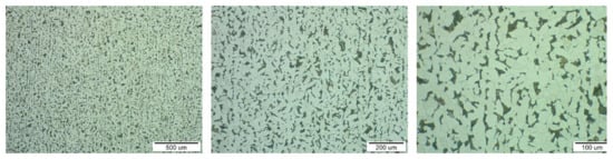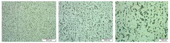 Metallographic structures of samples taken in longitudinal (Figure 6, area A) and transverse directions (Figure 6, area B) together with the respective scales are shown at different magnifications in Figure 7 and Figure 8. The analysis was performed on a light microscope Olympus VANOX–T (Tokyo, Japan). The structure can be characterised as ferritic-pearlitic with a low proportion of perlite. In the transverse direction, there is a structure with an indication of a row arrangement.