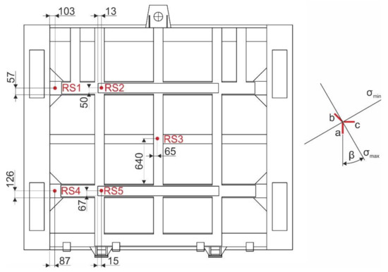 The values of the strains εa, εb and εc released in the drilling process were recorded with a strain gauge model P3, manufactured by MM-Vishay and subsequently processed and evaluated in accordance with ASTM E 837-13a [27]. Principal normal stresses and their directions in locations RS1 to RS5 were obtained from the values εa, εb and εc using the H-Drill software. The values are given in Table 4. Angle β indicates the directional deviation of the maximum principal stress from the grid axis a (Figure 9), while its positive orientation is considered clockwise. For the stress analysis, values of equivalent stresses were calculated at the drilled points according to von Mises theory