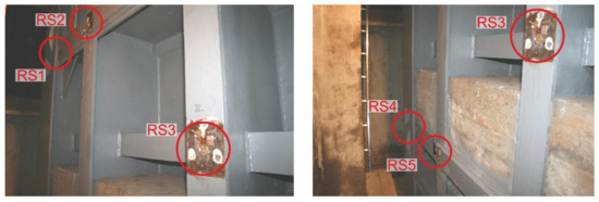 For the measurement of residual stresses, a semi-destructive drilling method was chosen in accordance with ASTM E837-13a [27]. When choosing the measuring points, the authors relied on professional knowledge as well as their own experience gained when solving similar tasks of welded steel structures [28,29,30]. Figure 9 shows positions “RS1” to “RS5” where strain gauges were applied, including the orientation of individual grids. When selecting these measuring points, the current state of the steel structure of the sluice gate was also taken into account, especially the surface unevenness.
