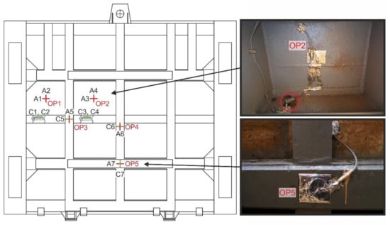 Gauge application points were chosen outside local concentrations to allow validation of measured values with results determined by numerical modelling. Such points are flanges of the reinforcing ribs near the axis of symmetry. In order to obtain higher levels of measured strains, the measurement was also performed on the rib in the area with the highest values of hydrostatic pressure. The application points of strain gauges OP1 to OP5 on the sluice gate are shown in Figure 11. Strain gauges type XY91-10/120 manufactured by HBM (Darmstadt, Germany), series A 405/33, serial number 812056981 with ohmic resistance of 120 Ω ± 0.5% were used for the measurement. Deformation sensitivity constant ka was 2.05 ± 1% and kb was 2.01 ± 1%. The effects of temperature on the measured values were compensated by connecting active gauges together with compensation gauges to a half bridge. At measuring points OP1 and OP2, a biaxial (planar) stress was assumed with directions of main stresses identical to horizontal and vertical directions. The axes of active measuring grids A1 to A4 at locations OP1 and OP2 were identified with these directions. Compensation gauges C1 to C4 were applied to unloaded steel sheets which were lightly attached to the sluice gate. Measuring grids of active and compensation gauges at OP1 and OP2 were connected to adjacent branches of the Wheatstone bridge with sensitivity n = 1, thus compensating for the effect of temperature change. At the measuring points OP3, OP4 and OP5, i.e., in flange centres, a uniaxial (linear) stress was assumed with the direction of the main stress identical to the longitudinal direction of the respective flange. The axes of active grids A5 (vertical direction), A6 (vertical direction) and A7 (horizontal direction) were identified with each of these directions (Figure 11). Measuring grids C5, C6 and C7 as parts of strain gauges at OP3 to OP5 fulfilled both active and compensatory roles. Figure 11 shows an example of applied active and compensatory strain gauges after application of protective agents at OP2 and OP5.