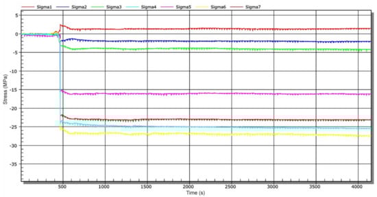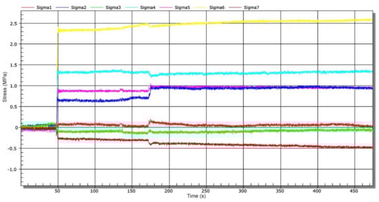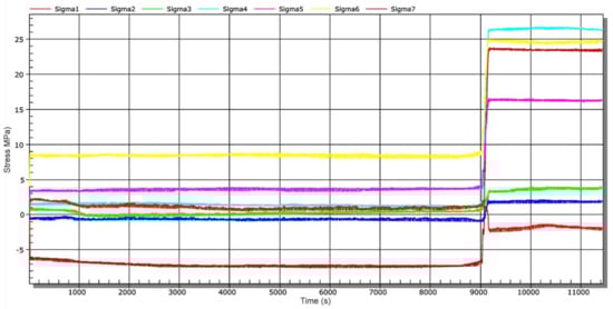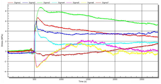 After this time, other operational measurements were performed. Figure 15 shows a time-dependent chart of stress changes during water inlet into the connecting water tunnel—stage 4. The water inlet was carried out by gradual lifting of the sluice gate approximately 20 cm above the threshold of the connecting water tunnel (not to position 2, Figure 1). This means that the inlet to the channel has not been completely opened (Figure 1, position 2). The measurement started simultaneously with the sluic gate lifting process. At approx. 9150 s, the connecting water tunnel was completely filled, which is documented by a step stress change (Figure 15).