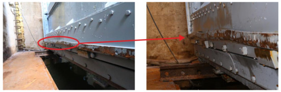After the blocking sluice gate was lifted above the water level (stage 6), a permanent deformation of the bronze sealing (Figure 16) was found, which probably occurred due to the sudden settlement of the sluice gate during its first lowering (stage 3). However, even such a significant deformation during the monitored period (approximately 2 weeks) did not cause water leakage into the connecting water tunnel. Nevertheless, in order to ensure safe and reliable operation of the sluice gate, it is necessary to repair the seal and to more closely monitor the process of sluice gate lowering.