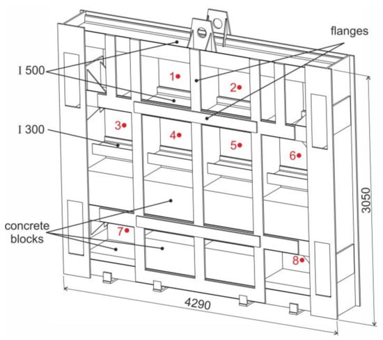 For the purposes of numerical modelling as well as for the analysis of deformations and stresses under operating load, it was necessary to determine the shape and basic dimensions of the sluice gate, including the thickness of sheets. In this case, it was a matter of determining the actual thickness, which took into account mainly corrosive losses of the material. The thickness measurement was performed by the measuring system TG 400 (NDT Systems, Huntington Beach, CA, USA) with measuring accuracy 0.01 mm. It is a small, easy-to-use, contact ultrasonic device with high resolution for direct reading of the measured value. Prior to the measurement, calibration was performed on steel reference gauges. When selecting places for thickness measurement of individual elements of the sluice gate, real operating conditions and accessibility of measuring points were taken into account. For this reason, the following measuring points were selected for individual elements of the sluice gate: rear plate—8 points, side elements—8 points, profile I 500—6 points, profile I 300—4 points, reinforcement elements—6 points and flanges—12 points. Figure 17 shows an indication of positions for the thickness measurement on the back plate of the sluice gate.
