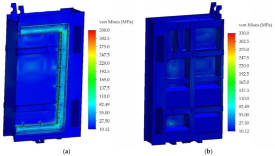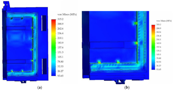 Fields of equivalent stresses according to von Mises theory: (a) front view and (b) rear view.