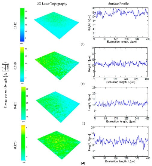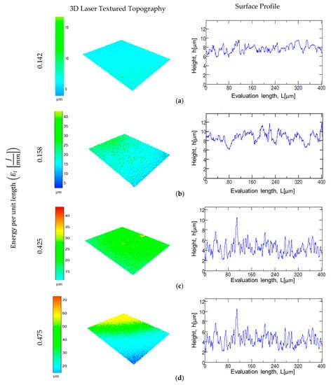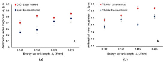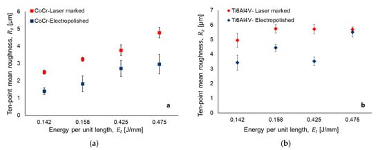 - The surface topography modification was related to the HAZ by means of the energy per unit length during laser texturing. For CoCr alloy, an increase in the energy per unit length (El) shows a linear increment of surface roughness parameters, whilst for the Ti6AL4V-ELI alloy, the laser effect at high El remained constant.