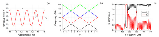 The electromagnetic response (i.e., relative amplitudes of reflected and transmitted plane waves normally scattered on the sample of finite thickness ) of material with spatial refractive index distribution may be calculated using matrix method [22,23] (see Appendix B). The results of S-parameters calculations for mm are presented in Figure 1c. The material becomes to be not transparent and electromagnetic waves are reflecting from it near 140–163 GHz. The second and third reflection and transmission peaks also exist at the frequencies near 300 GHz and 450 GHz. The most pronounced is the first peak, the second one has lower amplitude and is more narrow, the amplitude of the third peak (and all next ones) becomes almost comparable with the interference oscillations related to the finite size of a sample .