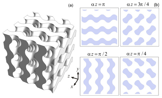 where C is parameter related to the average porosity of the structure [25] and is the scaling factor. Below we will use the scaling factor mm. The typical gyroid-based structure with porosity 60% related to is presented in Figure 2a. The cross-sections perpendicular to z-axis are presented in Figure 2b. They are forming periodic patterns of air voids and material areas depending on depth .