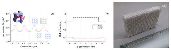 The calculated distribution of refractive index using Equation (6) is presented in Figure 3b, where we used the typical for TPU value of refractive index . This distribution will be used below to calculate transmitted and reflected signals along z-axis of three periods thick layer (see Figure 3c) formed by gyroid infinitely translated along x- and y-axes (total thickness of structure was mm).