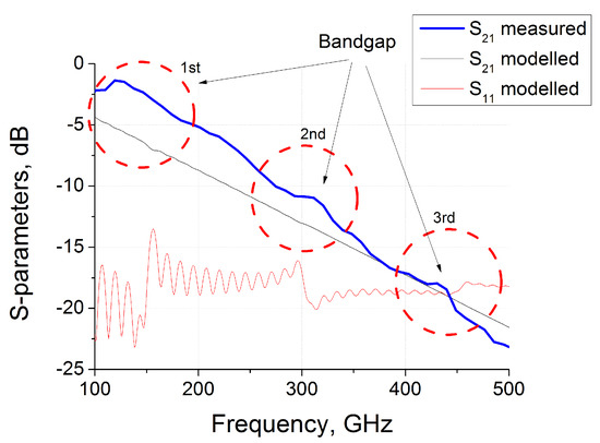 It is important to note that without losses the expected spectra of produced sample are very similar to that presented in Figure 1c. In the terahertz region, the losses in the polymer matrix become significant for samples with a thickness of more than several millimeters. For thick samples, the transmission substantially decreases with frequency. This tendency is clearly seen in Figure 4. Due to dumping, the partial waves deeply penetrating the material have reduced impact on the overall electromagnetic response. The interference oscillations are smoothing and the band structure becomes less visible. Actually, in the experiment (Figure 4) we observed only “traces” of the band structure theoretically predicted. Nevertheless, the positions of peaks correspond to the expected frequencies.