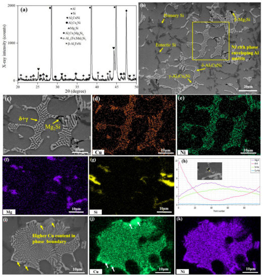 (a) XRD spectrum, (b) Typical microstructure, and (c) Local enlarged view of as-cast Al-Si alloy; (d) Cu distribution mapping of (c); (e) Ni distribution mapping of (c); (f) Mg distribution mapping of (c); (g) Si distribution mapping of (c); (h) Line scan results of Mg2Si phase; (i) Typical (δ + γ) peritectic structure; (j) Cu distribution in peritectic structure; (k) Ni distribution in peritectic structure.