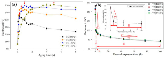 (a) T6 aging curves with four aging temperatures (160–235 °C); (b) Thermal exposure curves of four T6 Al-Si alloys to 300 °C; Insert: the matrix micro-hardness evolution of T6 (235 °C) Al-Si alloy.