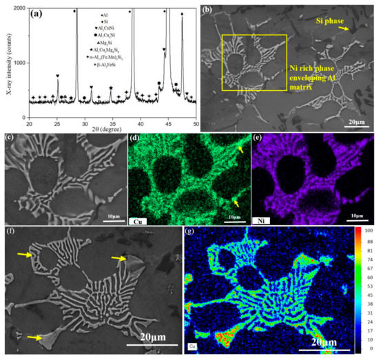A local enlarged view for the second phases in as-cast Al-Si alloy (Figure 1c), and the corresponding element mapping images (Figure 1d–g) are also exhibited. The bright grey part is the Ni-rich phases, which shows the network-like structure of short rod assemblies. This microstructure should be composed of δ-Al3CuNi and γ-Al7Cu4Ni as suggested by Yang et al. [10], where the γ-Al7Cu4Ni phase is transformed from the δ-Al3CuNi phase by the peritectic reaction: