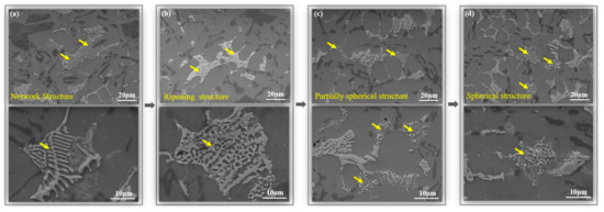 Compared with the initial network structure of the Ni-rich phases, these phases with ripening structure have larger roundness and coarser characteristics (Figure 4a,b). Notably, the Ni-rich phases with ripening structure can still maintain their initial interconnected morphological features. Besides, the Ni-rich phases with spherical cluster structure has completely lost of the interconnection characterization, which means the reduction of their load carrying capacity. For example, Zuo et al. reported that the reduction of the alloy’s mechanical properties was due to the morphological transformation of the Ni-rich phases, which was from the network structure to the spherical-shape during the exposure process [14].