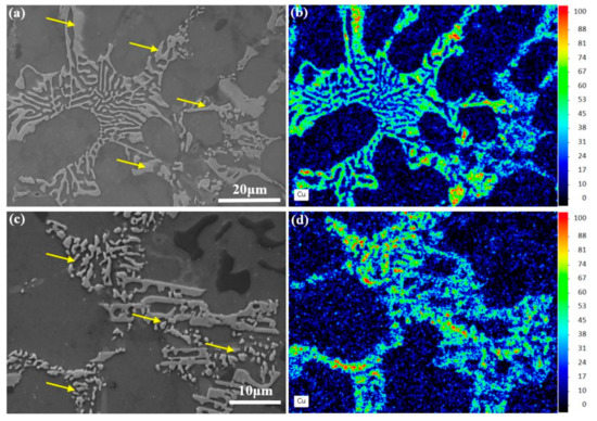 From the element mapping (Figure 1f) and line scanning results (Figure 1h), the strip shape can be determined as Mg2Si phase. This phase is usually dissolved into the matrix by solution treatment, and the coherent β″ or semi-coherent β′ phase should precipitate during the following aging process. However, both β″ and β′ precipitates are inclined to coarsen and lost their pinning effects on dislocations when the service temperature exceeds 170 °C [17]. Therefore, the Mg2Si phase has inferior contribution to the high temperature property of the Al-Si alloy.