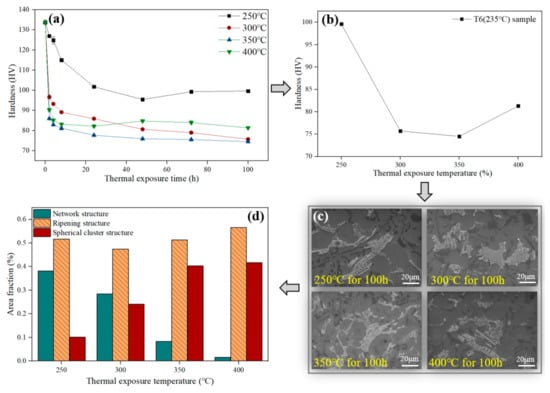 Thermal exposure experiments at various temperatures are carried out to offer the more comprehensive understanding of the hardness changes of the Al-Si piston alloy under actual working conditions. Furthermore, the relationship between the Ni-rich phases and the alloy hardness evolution should be discussed by four main steps (Figure 6). The hardness evolution of T6 (235 °C) alloy under different exposure temperatures is displayed in Figure 6a. There are four exposure curves showing the similar hardness changing trends, where a sharp hardness decreases in the first few hours, and then slows down in subsequent exposure process. The differences are exhibited in their hardness decreasing rate in the first stage of exposure process and the final hardness of the alloy. For instance, the alloy has the smallest hardness decreased rate (1.3 HV/h) and the largest final hardness (103.5 HV) during 250 °C exposure process. Conversely, the maximum hardness reduction rate (26.5 HV/h) and the minimum final hardness (79.3 HV) have found in the 350 °C thermal exposure process instead of 400 °C.