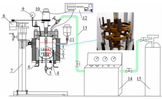 Schematic of experimental setup. 1. Autoclave body; 2. Agitator shaft; 3. Sample fixture; 4. Sample; 5. Outlet; 6. Electric heater; 7. Lifting device; 8. Motor; 9. Pressure gauge; 10. Magnetic stirrer; 11. Expander; 12. Control cabinet; 13. Gas pipeline; 14. Booster pump; 15. CO2 storage tank.