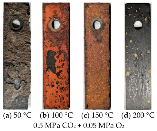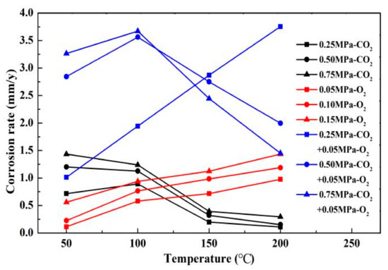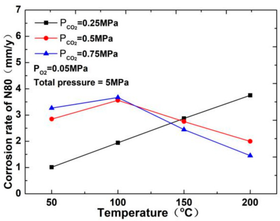 Temperature can affect the gas dissolution and diffusion rate and further affect the composition, compactness, and corrosion rate of the corrosion product film of N80 steel in the CO2–O2 environment. As shown in Figure 2, when the partial pressures of CO2 are 0.50 and 0.75 MPa, and the temperature is less than 50 °C, the slow diffusion rate of O2 causes the surface corrosion of the material to be dominated by CO2 corrosion. When the temperature continues to increase and is less than 150 °C, part of the FeCO3 film will be transformed into Fe2O3. At this time, the corrosion rate increases because Fe2O3 is loose and easily falls off. Meanwhile, due to changes in the structure of the corrosion product film, a part of the corrosion product film is easily penetrated by O2 and Cl−. Fe ions can also diffuse into the solution through the microporous structure on the corrosion product film, which accelerates the dissolution of iron. When the temperature is higher than 150 °C, several iron oxides become dense and protective, and the corrosion rate will decrease.
