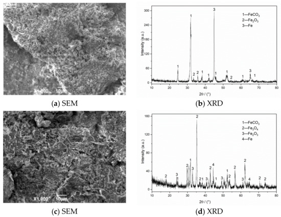 The SEM morphology and XRD test results of corrosion products of N80 steel at different CO2 partial pressures are shown in Figure 7. The SEM result with a CO2 partial pressure of 0.25 MPa shows that the corrosion products on the surface layer are relatively thin and have not been connected to form an overall structure. When the partial pressure of CO2 increases to 0.5 MPa, the product film falls off significantly, and large corrosion cracks appear on the surface. The iron oxides completely cover the original corrosion products to form a double-layer film structure on the surface in a high-concentration CO2 environment (PCO2 = 0.75 MPa). This kind of membrane structure is not dense or unstable and is easily washed off by the solution, which causes the internal matrix to continue to corrode. The XRD measurement results of the corrosion product of the material show that the surface of the corroded material is covered with FeCO3 grains and iron oxides because when the corrosive environment contains CO2 and O2, FeCO3 and Fe(OH)2 corrosion product films will appear on the initial surface, and then O2 in the environment will oxidize with Fe(OH)2 and FeCO3 to form iron oxides [3,7]. The corrosion products on the final surface are mainly iron oxides, such as FeCO3, Fe2O3, and Fe3O4. The outer layer of the formed double layer corrosion product film is mainly composed of FeCO3 and Fe oxides, while the inner layer is mainly composed of regular grained FeCO3. Compared with a single CO2 corrosion product, the appearance of oxides reduces the integrity of the corrosion product film and increases the corrosion rate of the material.
