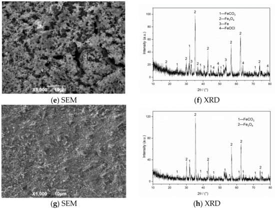SEM morphology and XRD of N80 steel under different temperatures in environment of coexisting CO2–O2, (a,b) T = 50 °C, (c,d) T = 100 °C, (e,f) T = 150 °C, (g,h) T = 200 °C. PCO2 = 0.5 MPa, PO2 = 0.05 MPa.