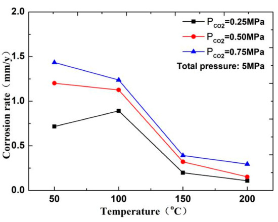 In this experiment, the pH of several groups of media is between 4 and 6. As shown in Figure 10, the CO2 corrosion rate decreases with increasing temperature. Therefore, when the temperature is less than 100 °C, a H depolarization process exists in the electrochemical reaction. The process is completed by HCO3− and H+, which are decomposed by H2CO3 in the solution. The higher the partial pressure of CO2 is, the higher the solubility of H2CO3 is, and the higher the H+ concentration produced by the hydrolysis of H2CO3 in the solution will be, thereby resulting in fast corrosion of the material [17,18]. However, in a high-temperature environment (T > 150 °C), the decrease in the solubility of CO2 and increase in pH of the solution reduce the anode reaction rate. Therefore, the corrosion rate increases with the increase in CO2 concentration at low temperature but decreases at high temperature.