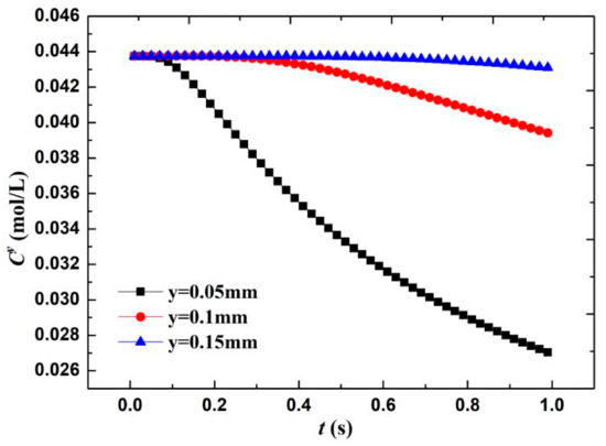 where the erf(y) is the error function, and the O2 concentration in the water is approximately equal to 0.044 mol/L [20]. According to the diffusion layer thickness formula δ = (πDt)0.5, the calculated boundary layer thickness when O diffuses for 1 s is 0.08 mm. Therefore, three positions near the wall—that is, y = 0.05 mm, diffusion layer interface y = 0.1 mm, and outside the diffusion layer y = 0.15 mm—are taken to calculate the change in O concentration Cy. As shown in Figure 13, when the wall surface O concentration was 1/10 of the diffusion outer layer concentration, the O molecules participating in the electrochemical cathode reaction accounted for 90% of the total molecules. The O concentration in the diffusion layer (x = 0.05 mm) significantly decreases with time—that is, approximately 38% in 1 s. Meanwhile, the diffusion layer interface (x = 0.1 mm) only decreases by 10%. This result shows that in the film, within a short time of the formation of the electrochemical system, the concentration of the reactants forms a larger concentration gradient in the diffusion layer because the oxygen content that is involved in the reaction accounts for 90%, the electrochemical reaction is rapid, and the system is controlled by the reactant concentration.