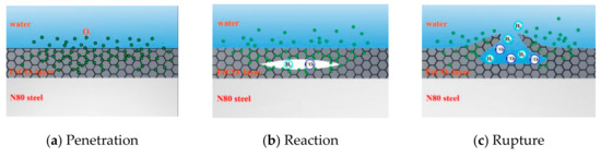 In addition to the effect on the priority of the reaction on the metal surface, the penetration of O2 into the product film will also affect the surface structure. As shown in Figure 14, local reactions occurred inside the product film because the FeCO3 film was not enough to isolate O2 molecules, and the liquid flow made the product film thin. When O2 molecules enter the film, they will react with FeCO3 to form Fe2O3 and CO2, and a small amount of H2 will be generated by the partial H evolution reaction. When gas accumulates inside, it will swell inside the product film and eventually break the film. The flow of external liquid will also accelerate the rupture of the corrosion film.