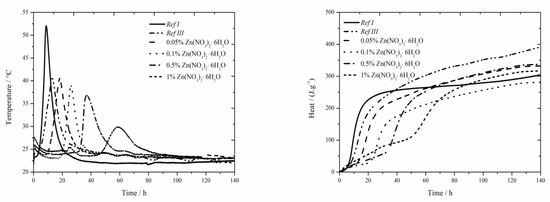 Total released heat was recorded for the time of 170 h. None of the samples reached the values as high as that of Ref I after such long period of time. The mixtures containing 0.05 and 0.1 wt.% of zinc released the heat comparable to that of Ref III (higher by 3 J∙g−1). Zinc in the amount of 1 wt.% released significantly less heat than Ref III. We can suppose though, that during further hours the hydration would release further heat and that the final heats would reach similar values.