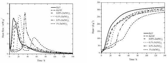 The data for the zinc chloride sample are shown in Figure 4. For all observed zinc concentrations, the heat flow is increased compared to Ref III, but none achieved the value of Ref I. Increased content of zinc increases the heat flow maximum. The differences in heat flows for the samples containing zinc in the form of ZnCl2 are very small. Total released heat values in the samples containing 0.05 and 0.1 wt.% of zinc after 140 h were comparable to Ref III, the values were lower by 4 J∙g−1. Increasing amount of zinc decreased the released heat. The difference in heats between samples containing 0.05 and 1 wt.% of zinc makes only 20 J∙g−1. These very small differences could be caused by inaccuracies during the measurements.