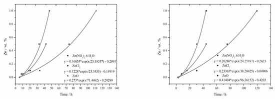 The resulting equations in Figure 7 are usually created from four points. The results from measurement for the sample containing 1% of Zn in the form of ZnCl2 was not included into the evaluation, since the acceleration of hydration, disallowing this way of evaluation, occurred in large extent. All curves created by fitting the recorded data with exponential function in Figure 7 exhibit only minimal deviations from real data. Statistical significance was checked for these equations.