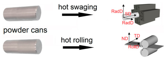 The containers for hot rolling and hot RS made from stainless steel tubes were filled with the mechanically alloyed powder, evacuated, and sealed by welding. The rolling container was hot rolled in three steps from the initial diameter of 20 mm to the final thickness of the sheet of 3.2 mm at 960 °C. The swaging container was hot rotary swaged from the initial diameter of 50 mm to the final diameter of 15 mm at the same temperature, to provide similar hot consolidation conditions. The schematic depiction of the rolling and swaging processes of the new-generation ODS alloy, including geometries of the canned semi-products and definition of the further described directions, is shown in Figure 2. After stripping from the containers, the consolidated new-generation ODS alloys were secondarily recrystallized by annealing in a vacuum furnace at 1200 °C for 4 h.