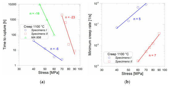 Comparison of (a) time to rupture; (b) minimum creep rate for Specimens I and II. Interrupted creep test of Specimens II at 60 MPa is used to determine the minimum creep rate.