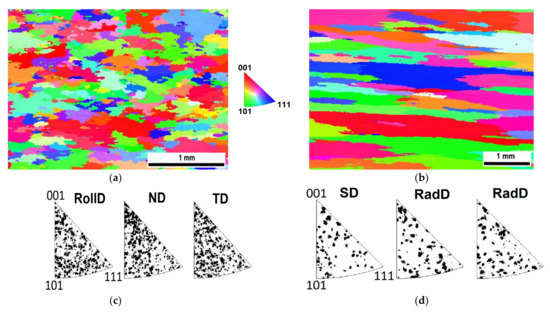 Comparison of grain microstructures after secondary recrystallization (a) Specimens I in RollDxND plane; (b) Specimens II in SDxRadD plane, scanning electron microscopy (SEM)–electron backscatter diffraction (EBSD) inverse pole figures for (c) Specimens I; (d) Specimens II. Individual directions are defined in Figure 2.