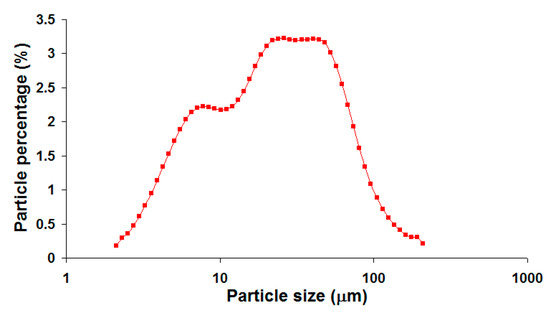 The raw material CFA was obtained from Sultan Salahuddin Abdul Aziz coal-fired power plant located in Kapar, Malaysia (coordinates: 3.117471,101.321842). The power plant consists of pulverized coal boilers manufactured by Ishikawajima-Harima Heavy (IHI), (Tokyo) Japan, and the coal feedstock was mainly imported from Australia and Indonesia. The kaolin clay (AKIMA-35) was obtained from Associated Kaolin Industries Co., (Petaling Jaya) Malaysia. Both crystalline and amorphous phases were detected in the CFA. The major crystalline phases identified were quartz and mullite [13]. The crystalline phases of kaolin clay were kaolinite (Al2O3·2SiO2·2H2O), quartz and a small amount of muscovite (mica) phase [14]. Table 1 lists the chemical compositions of CFA and kaolin clay, which were reported in our previous works [13,15]. The particle size distribution of the CFA as shown in Figure 1 was reported in previous work [16]. The CFA has a very broad bimodal size distribution ranging from approximately 2 µm to slightly over 200 µm and an average particle size (d50) of 21.83 µm.
