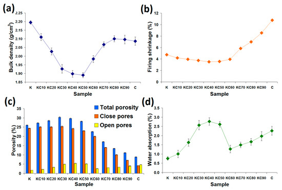 Figure 2c shows the percentage of closed pores and open pores, as well as the total porosity of the fired ceramics. The total porosity of the fired ceramics was initially increased with increasing CFAG content. The highest value of 30.34% was achieved by an addition of 30 wt % CFAG (KC30), which represents a 4.26% increase over sample K. However, the total porosity subsequently dropped to 8.86% as CFAG content reached 100 wt % (a 17.22% drop compared to sample K). Other than this, it was found that the pores in the fired ceramics consisted mainly of closed pores except for sample C. The results also reveal that CFAG addition has minimal impact on the open pores compared to the closed pores.