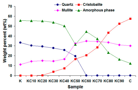 The mineralogical compositions of the ceramics that were fired at 1200 °C are given in Figure 3. The results were computed using diffraction data analysis software X’pert HighScore Plus version 2.2b (PANalytical Inc, Almelo, Netherlands). The software was used to profile fit the diffraction data, and the goodness of fit (GOF) values of the fitting ranged from 3.21 to 3.62. The result shows that CFAG addition has significant impacts on the mineralogy of the fired ceramics. Firstly, the mullite crystalline phase is noticeably higher in the fired ceramics with a CFAG content of 50 wt % and above. Besides the fact that CFAG contained higher amount of mullite than the kaolin clay after firing at 1200 °C, the minor oxides (Fe2O3 and TiO2) found in CFAG are believed to have played an important role in the growth of mullite crystals. Fe2O3 and TiO2 have been reported to be able to lower the activation energy of the reaction and enhance the reaction rate of Al2O3-SiO2 to form mullite [23]. Secondly, the cristobalite (SiO2) crystalline phase in the samples increased with increasing CFAG addition. Cristobalite is a silica polymorph that can be transformed from quartz. Although kaolin clay has a substantial amount of quartz, the quartz was not transformed to cristobalite during firing at 1200 °C. The quartz from kaolin clay only changes to cristobalite upon firing at temperatures between 1200 °C and 1400 °C [24]. On the other hand, quartz from CFA has a higher ability to transform to cristobalite at temperatures below 1200 °C. This is attributed to the alkali metal oxides found in CFA that can accelerate the devitrification rate of silica into cristobalite [25]. This explained the high content of quartz in kaolin-rich samples and high content of cristobalite in CFAG-rich samples. Thirdly, the result shows a general decrease in the amorphous phase from sample K to C. The decrease was due to the lower amount of amorphous phase present in CFAG when fired at 1200 °C. In the same figure, a sharp decrease in amorphous phase can be seen in sample KC50. This was attributed to the large increments of the crystalline mullite (from 16.6 wt % in KC40 to 32.3 wt % in KC50) and cristobalite (from 7.4 wt % in KC40 to 16.6 wt % in KC50) phases as well as the large amount of quartz (19.5 wt %) that remained unvitrified in the sample. The full vitrification of quartz (0 wt % quartz) seen in sample KC60 subsequently increased the amorphous phase.