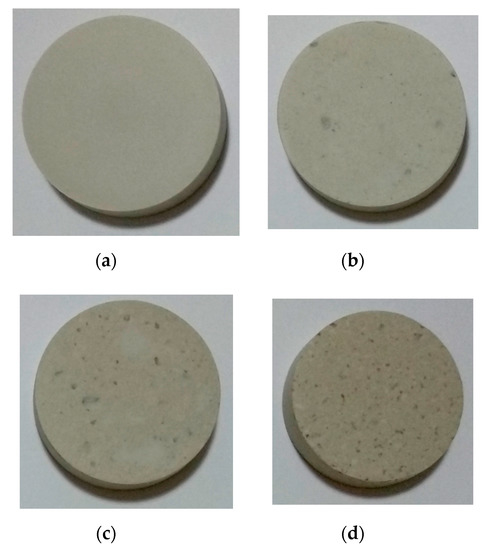 The macromorphology of the fired ceramics is shown in Figure 4. All the obtained ceramics with various amounts of CFAG have good dimensional stability at the firing temperature of 1200 °C. No cracks and no signs of melting such as bloating and deformation were noticed in the samples. However, different degrees of shrinkage were observed in samples with high CFAG content, which is measured and represented in Figure 2b.