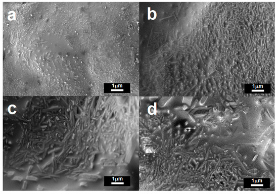 Figure 5 shows the FESEM micrographs of the samples. Figure 5a shows that sample K consists of a number of crystals embedded in an amorphous glass matrix. The crystals are a combination of easily distinguishable acicular mullite crystals as well as quartz crystals of different sizes and shapes. The mullite crystals were nucleated and grown from the thermal decomposition of kaolinite [20]. The microstructure of KC50 is shown in Figure 5b, and considerable growth of high aspect ratio mullite crystals is observed. Overall, the amount of mullite crystals is apparently higher in those fired ceramics with CFAG addition; this observation agrees well with the mineralogical compositions of the samples (Figure 3). Relatively larger crystals with low aspect ratio can be observed in samples with high CFAG content, for example, KC60 and C as shown in Figure 5c,d. These crystals are suggested to be cristobalite (Figure 3). Therefore, it can be concluded that CFAG addition promotes the growth of mullite and cristobalite crystals.