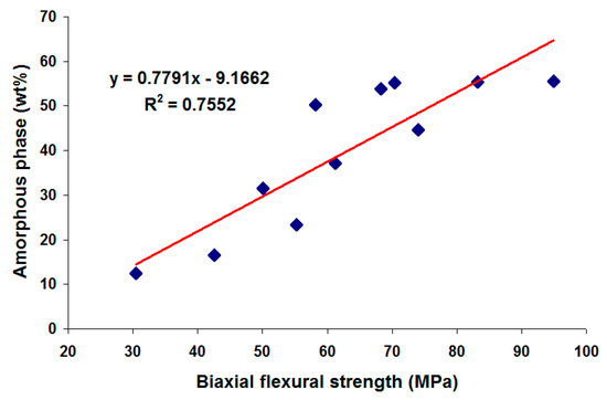 Correlation of the biaxial flexural strength and amorphous phase content of the fired ceramics.