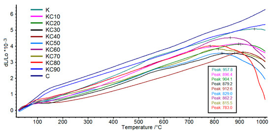 Thermal expansion curves of the fired ceramics at temperatures from 30 °C to 1000 °C. Inset: temperature of maximum expansion of the fired ceramics.