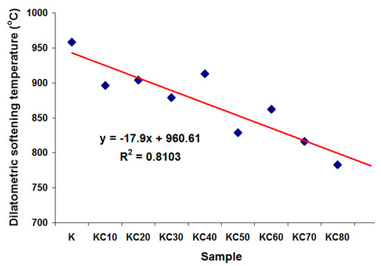 The refractoriness of ceramics is usually measured by its softening point. The higher the temperature of the softening point, the higher the refractoriness of the ceramic. In this dilatometry analysis, the temperature of maximum thermal expansion, which is referred to as the dilatometric softening temperature, is used to gauge the refractoriness of the fired ceramics. Figure 8 shows that when kaolin clay was gradually replaced by CFAG in the ceramic’s composition, a gradual decrease in the dilatometric softening temperature was observed. Figure 9 illustrates the inverse linear relationships between the dilatometric softening temperature and CFAG content of the samples, which shows a negative linear correlation of 0.81. This can be explained by the high content of alkali metal oxides (K2O, CaO) in CFAG. The alkali metal oxides are well-known to create fluxes in ceramic making, which can reduce the working temperature and lower the melting point of ceramics. One should note that samples C and KC90 have surprisingly very high dilatometric softening temperatures (beyond 1000 °C) even though they had higher content of alkali metal oxides. Thus, it can be concluded that the softening effect was dependent on the presence of an adequate amount of kaolin clay.