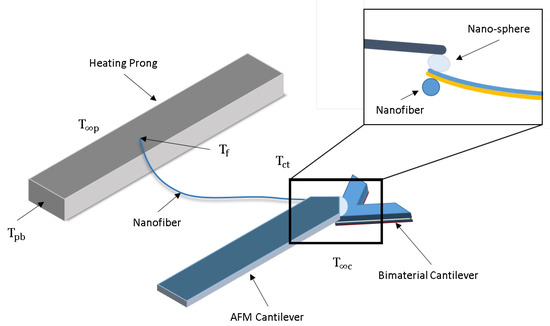 The complete system utilizes an AFM, constructed loading sample plate with a (Cu) heating prong, along with tipless (Si) and bimaterial (Au/SiN) cantilevers tipped with a micro-sphere of radius 15 m. The heat source is a ZENY 862D+ soldering iron with controlled temperature and is transferred sequentially through the sample plate, Cu heating prong, nanofiber, and lastly to the tip of the bimaterial cantilever. The competing thermal expansion of the Au and SiN in the bimaterial cantilever exerts a force on the tipless AFM cantilever (AFM Workshop, Hilton Head Island, SC, USA) which is recorded by a 1 mW sensing laser (AFM Workshop, Hilton Head Island, SC, USA). From one-dimensional natural beam deflection theory and Hooke’s law, this deflection is used to obtain the temperature output, temperature at the cantilever tip (), from the nanofiber at the tip of the bimaterial cantilever. In congruence, the temperature of the nanofiber () measured at the heating prong is obtained through the use of thermocouples. The thermal conductivity of the nanofiber () can be characterized after determining the heat flux through the appended nanofiber.