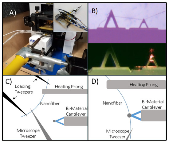 Experimental setup of (A) AFM sample plate when inserted into the AFM. Inset shows thermocouple positions on the sample plate. (B) Microscope image of a nanofiber appended to the bimaterial cantilever via van der Waals forces (top) and the calibration image of the cantilevers in the AFM (bottom). (C) Collecting the nanofiber from the electrospinning apparatus for appendage to the measurement apparatus. (D) Nanofiber appending itself to the bimaterial cantilever via van der Waals forces [27].