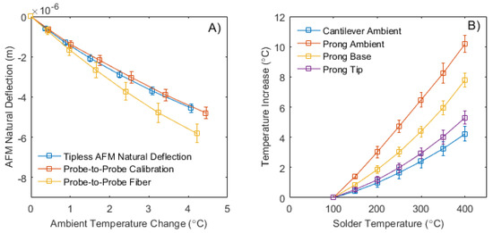 (A) Response of AFM cantilever with increasing ambient temperature during calibration and experimental scans. (B) Appended nanofiber temperature recordings at appended thermocouple positions (, , , and ) with increasing input solder temperature [27].