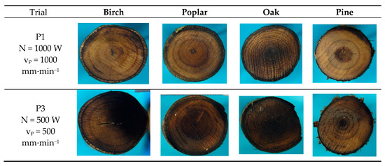 −1, respectively (P8). The laser settings used for samples P1 and P3 were sufficient for cutting wood samples with diameters ranging from 16 to 70 mm (corresponding to the diameters of branches cut in orchards and during conifer pruning). Given the obtained cutting effectiveness, subsequent trials could be considered superfluous. However, if the charring of the cut surface is assumed to be an equally important goal of the laser cutting of fresh wood, then only the settings for trial P8 can be deemed effective. In trials P1, P7, and P8, the degree of charring was clearly correlated with the delivered radiation energy per unit of cut area (