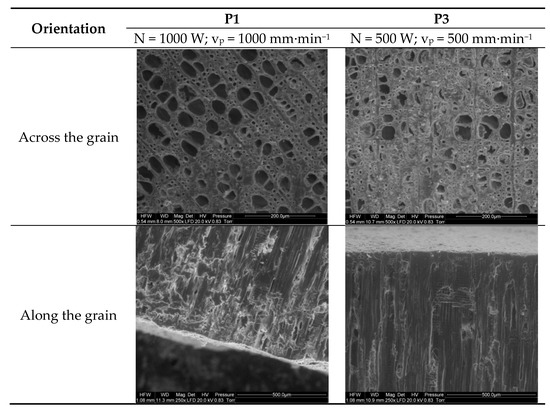 −1) and power (1000 W) led to well-defined bisected oval cells with visible lumina (P1). In turn, the second image (P3) shows earlywood in an annual ring (large cells) and latewood fragments in successive rings, above and below them, cut with a laser beam at half the power (500 W) and beam travel speed (500 mm∙min