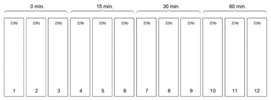 A water/gypsum ratio = 0.6 was forced by manufacturer specification for cement blends water/cement ratio = 0.5 was used. A glass fiber/total binder ratio = 0.02. 12 pcs. 40 × 40 × 160 mm according to standard PN-85/B-04500 was molded from every composition. Each ingredient specimen from the cement group was marked Z(1–5). Each specimen from the chosen group was marked additionally 1–12 according to mold position. Specimens were treated according to PN 85/B-04500 standard. After 28 days, the samples were subjected to subsequent tests. Gypsum specimens were marked G1. Each specimen from this group was marked additionally 1–12 according to mold position as shown in Figure 2. Gypsum specimens were cured in the air for 14 days. After 14 days, the samples were tested.
