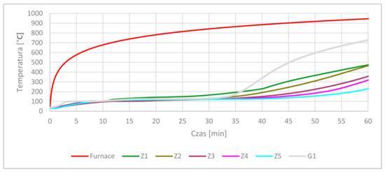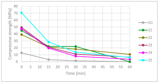After 15 min in the furnace, the gypsum specimens showed cracking of the visible surfaces. Longer time under high-temperature conditioning made the cracking more visible and deep. After 60 min, the gypsum specimens were fully cracked. After 15 min, smaller cracking was observed in the cement specimens than in the gypsum specimens. At 30 min at high-temperatures, cracking was on the same level as at the previous time. The most visible cracking lines were observed at Z1 and G1 samples. Volume expansion of cementous samples was a process observed for a time longer than 30 min. Visible crushing of the top corners and partial edges was visible in samples containing OPC cement under loads greater than 30 min. The corners and edge erosion may have been forced by dehydration and dehydroxylation of the original structure following moisture absorption by free lime during cooling in the air after heat treatment [16]. In parallel, the cracking effect after heating may have happened as an effect of thermal shock as a result of environmental changes from the hot furnace to a much colder laboratory [52]. The conducted tests gave data about the samples’ thermal response to elevated temperatures. The average results are presented in Figure 4.