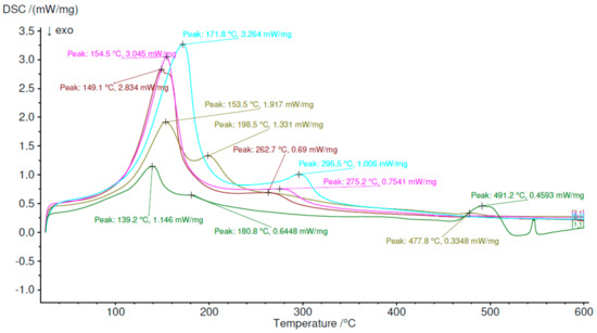 Differential scanning calorimetry (DSC) was used to confirm the results obtained from the furnace test. The advantages of this form of thermal testing are a smaller mass of samples than in a furnace test, the possibility of comparison with data standards and the value of enthalpy. The disadvantage is a general overview of sample behavior during tests. The DSC tests were conducted in Netzsch DSC 204 station. Tests were conducted in aluminum crucibles. The parameters of the tests are presented in Table 7.
