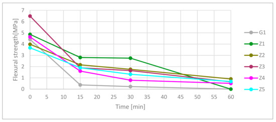 Test results shown in Figure 7 and detailed in Table 9 confirmed a drop in flexural strength of types of cement and gypsum-based ceramics under high-temperature exposure. Fifteen minutes of exposure caused a 92.1% plunge in flexural strength of the gypsum samples. In 15 and 30 min, the flexural strength of Z1 composites was higher than samples contain CSA. In 60 min, the flexural strength was the highest for Z2, Z5 material, where Z5 and Z3 had similar parameters.