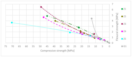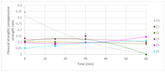 Figure 10 presents the flexural/compressive strength ratios (FS ratio). It needs to be mentioning that the presented results are in time function during exposure on high-temperature. During these test materials, strengths decreased in time, as shown in Figure 9. The highest flexural/compressive strength ratio was for a gypsum-reinforced blend at 0 min. It had rapidly dropped from 0.34 to 0.12 in the first 15 min under fire-temperature load. Next, the ratio increased to 0.17 in 30 min to fall to 0 in 60 min. The Z1 flexural/compressive strength ratio was equal to 0.11. The value of it increased to 0.13 in 15 min and stay at the same level to 30 min. FS ratio dropped down to 0 in 60 min. It shows that in the Z1 samples, the flexural strength during fire decreased slower than compressive strength in 30 min. After this time, flexural and compressive strength rapidly dropped down. Z2 had a similar mechanism of ratio flow. Starting at 0 min points and ending at 30 min, the FS ratio was 0.10. Next, it slowly decreased to a value of 0.08 after 60 min. This shows that flexural strength and compressive strength decreased comparably during high-temperature elevation. FS ratio of Z3 samples had fluctuating character during exposure on high-temperature. In the first 15 min, flexural strength decreased faster than compressive from 0.13 FS ratio to 0.09; in the next 15 min, behavior diverted from 0.09 FS ratio to 0.15. The last 30 min showed that the FS ratio decreases to 0.10. In the Z4 samples in which the FS ratio slightly decreased in the first 15 min, in the next 45 min, the FS ratio rose. This meant that compressive strength decreased more than flexural strength. The last samples, Z5, has increased the FS ratio in all time. FS ratio rises from 0.05 to 0.11 in 60 min, which means that the flexural strength decreased slower than compressive strength during high-temperature.